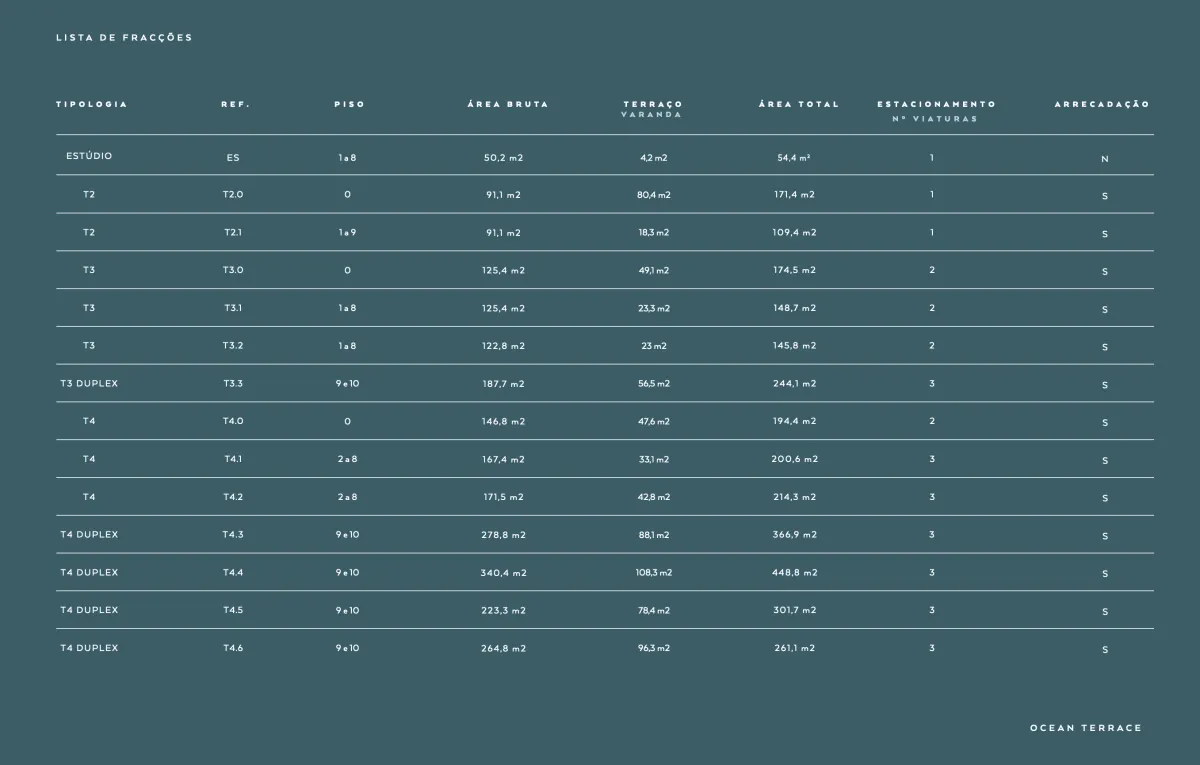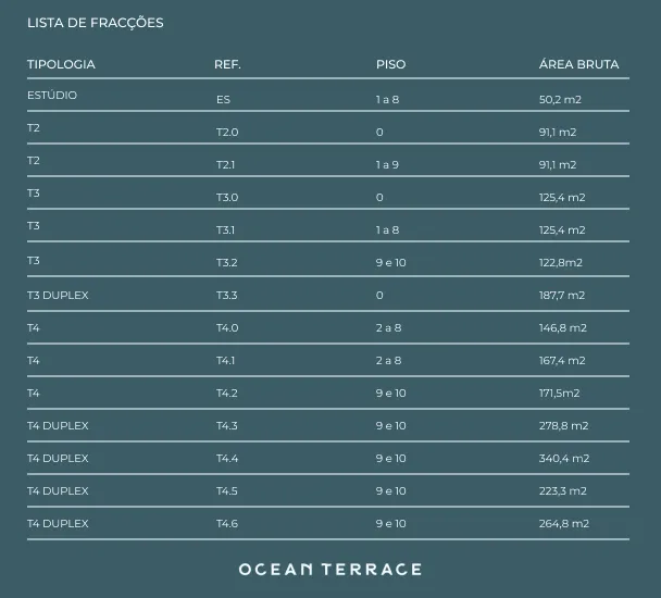Compreendendo apartamentos de tipologias Estúdio, T0, T1, T2, T3, T3 Duplex, T4, T4 Duplex e Penthouse, o Ocean Terrace apresenta-se como um empreendimento de excelência, onde nenhum detalhe foi deixado ao acaso para garantir que encontrará aqui o local ideal para viver.